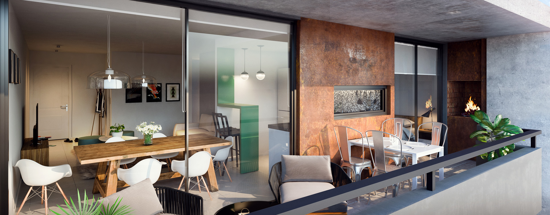 - Ambiente integrado de living comedor y cocina con barra desayunador