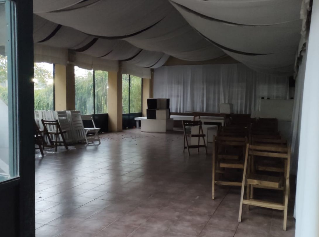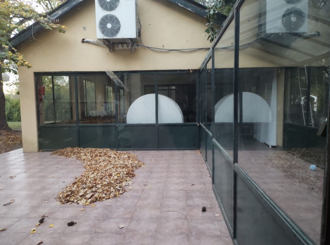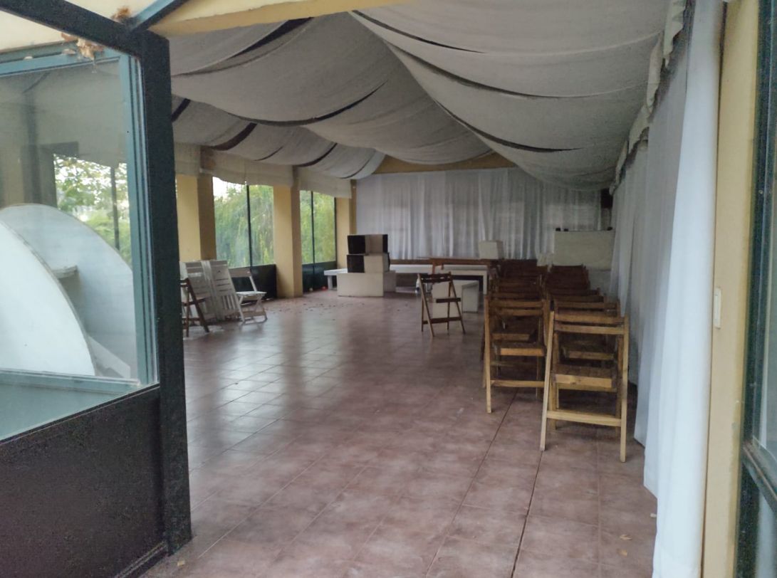 Construcción a dos aguas con pisos cerámicos, techo de chapa y cerramientos de vidrio. Aprox 80 m2 cubiertos.